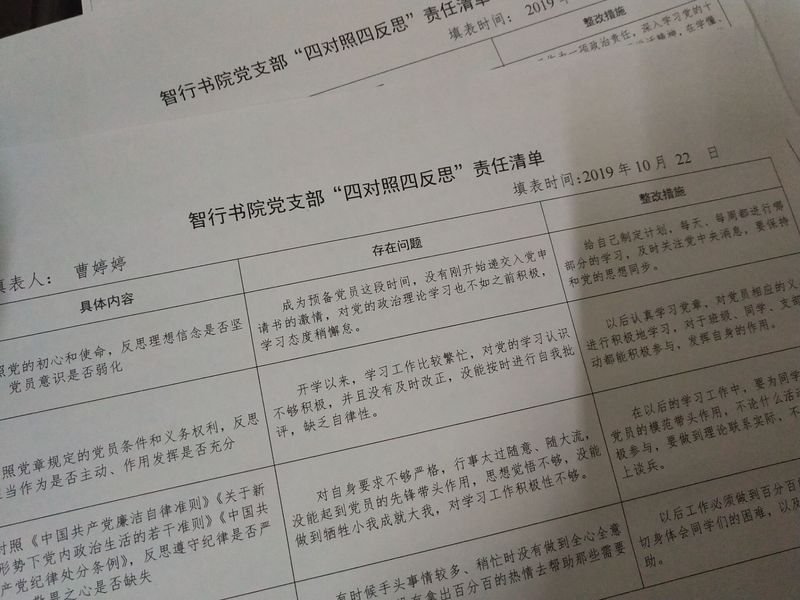 为督促党员发挥模范带头作用,推进智行书院“不忘初心、牢记使命”主题教育往深里走往实里做,10月22日,智行书院学生第一党支部在书院会议室组织全体党员联系思想工作实际,开展“四对照四反思”专题研讨,即:对照党的初心和使命,反思理想信念是否坚定、党员意识是否弱化;对照党章规定的党员标准,反思担当作为是否主动、作用发挥是否充分;对照《中国共产党廉洁自律准则》《关于新形势下党内政治生活的若干准则》《中国共产党纪律处分条例》,反思遵守纪律是否严格、敬畏之心是否缺失;对照群众提出的意见建议,反思宗旨意识是否牢固、服务群众是否到位。