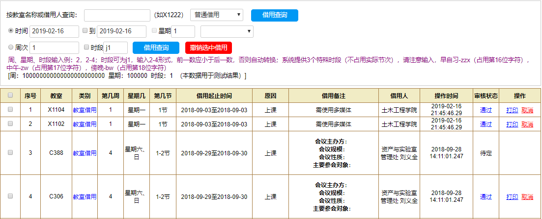 3、在“操作”栏下,对借用记录进行【打印】(打印借条)、【取消】(删除借用)的操作,同时可以通过“审核状态”栏下的【通过】操作,审核网络借用的教室的申请;