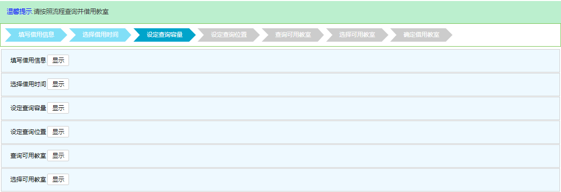 2、依次填写借用信息、借用时间、设定容量、设定查询位置、查询可以教室;