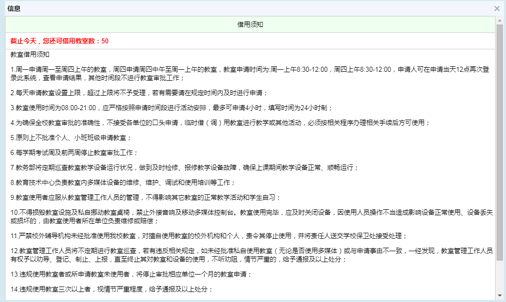 3、用户(学生、教师)进入【教室借用】>【教室借用】,阅读教室借用须知;