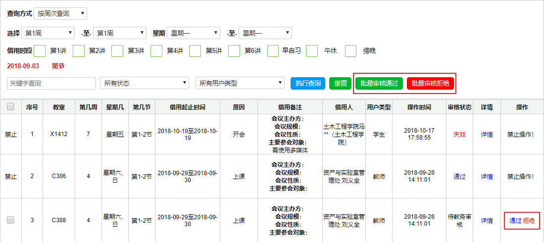 (3)勾选需审核的借用申请,点击【批量审核通过】或者【批量审核拒绝】完成教师借用申请审核;或者在需审核的申请后面“操作”栏下,点击【通过】或者【拒绝】完成审核;