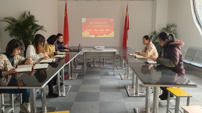 为了坚持和完善中国特色社会主义制度,推进国家治理体系和治理能力现代化,深入贯彻落实十九届四中全会精神。12月6日,党总支书记刘凯带领智行书院党总支在会议室以“守初心、担使命、找差距、抓落实”为主题展开十二月主题党日活动。
