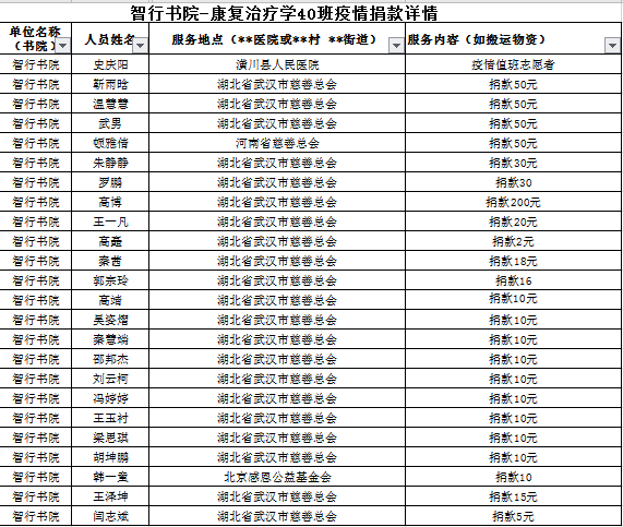 2月2日,智行书院2019级康复治疗学40班团支部发起“抗击疫情,希望同行”爱心援助活动, 此次捐助活动倡议支部团员青年伸出援助之手、汇聚爱心力量,一起帮助湖北渡过难关。团员青年积极响应号召,21名团员向湖北省武汉市慈善总会资金捐助,其余3名团员向当地医院或政府进行了捐款,团支部24名团员共计捐款646元。