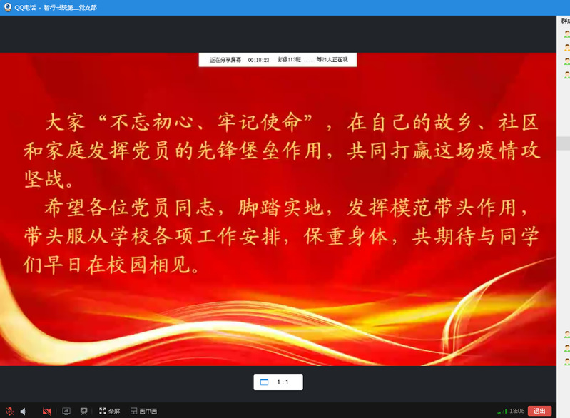 首先,支部书记闫亚菲老师带领支部党员学习习近平总书记关于疫情防控形势和做好疫情防控重点工作的讲话。其次,支部书记闫亚菲老师要求全体党员要提高政治站位,服从大局,坚决拥护并带头执行党中央和学校关于疫情防控工作的决策部署,牢固树立党员意识。最后,闫亚菲老师希望大家“不忘初心、牢记使命”,脚踏实地,带头服从学校各项工作安排,在自己的故乡、社区和家庭发挥模范带头作用,共同打赢这场疫情攻坚战。