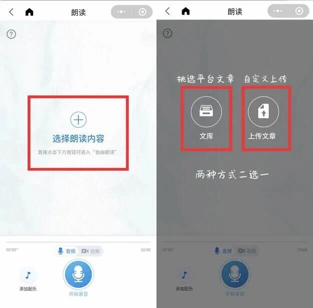 ③点击+号,进入“优谷文库”,请围绕“悦读·新知·致敬”主题选择文库中合适的素材进行朗读,要求内容健康积极、展示青年学生的精神面貌担当,也可以自己上传素材朗读。