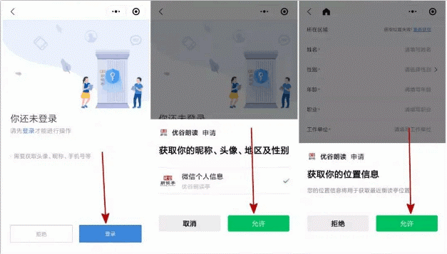 2.小程序授权登录点击【参与活动】后,如您是第一次使用小程序,系统将会请求使用您的头像、昵称、地区的,请一定要点击【允许】,否则无法参加活动。