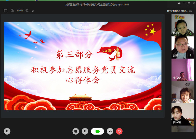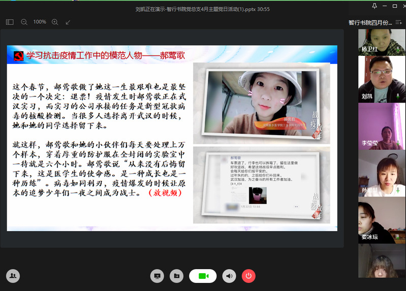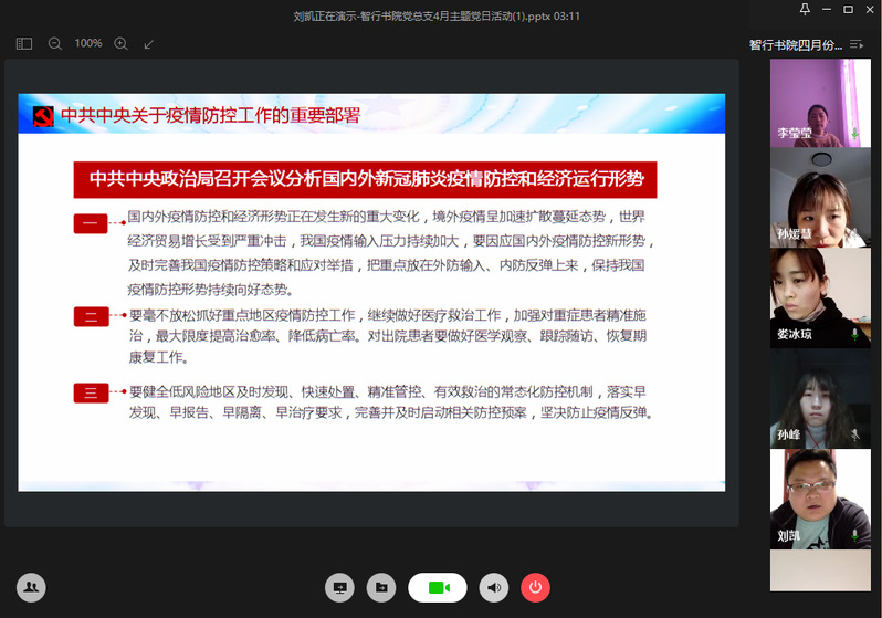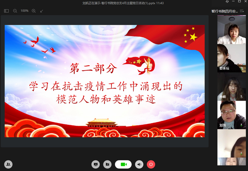 为坚决贯彻习近平总书记重要指示精神,强化基层党组织的战斗堡垒作用和党员先锋模范作用,激发党员践行担当使命,切实做好疫情防控,智行书院党总支于4月1日下午以线上视频会议的形式开展了“抗击疫情,党员先行”主题党日活动。活动由智行书院党总支书记刘凯主持,书院全体教师党员参加。
