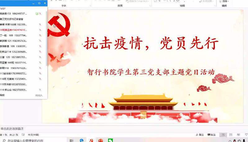为坚决打赢疫情防控阻击战,充分发挥基层党组织战斗堡垒作用和党员先锋模范作用,教育引导广大党员同志在疫情防控中磨砺担当之勇、科学防控之智、统筹兼顾之谋、组织实施之能,践行入党誓言、检验初心使命,4月1日下午,智行书院学生第三党支部开展“抗击疫情,党员先行”主题党日活动。本次活动由支部书记李莹莹主持,采取QQ群视频形式开展,支部全体党员参加。