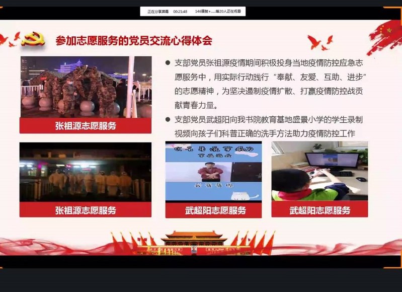 首先,闫亚菲带领大家学习了习近平总书记关于抗击疫情的重要指示和中央、省委、学校关于疫情防控工作的重要部署。其次,大家共同学习观看了八旬院士钟南山老先生手术后连夜奔赴武汉和我校郝莺歌同学在疫情来临时退票的故事。最后,由支部参加志愿服务的党员交流心得体会。张祖源说:“我在抗疫一线做志愿服务,主要为返许人员进行体温测量和记录;同时我还与许昌市军分区党员先锋队成员一同为医务工作人员搭建抵御寒冷的帐篷,为后勤工作提供强有力的保障。疫情期间我始终牢记自己共产党员的身份,用自己的行动去诠释作为一名共产党员的使命。党员武超阳在疫情防控期间,自行录制特色视频,向智行书院党员实践基地新乡市盛景国际小学的学生们传播疫情防控知识——七步洗手法、防控小知识、健身操等。他说道:“看到孩子们认真学习的样子,我深受鼓舞,无论何时,我都要谨记医学生誓言,向优秀的医务工作者看齐。”