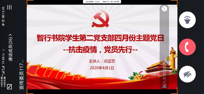 在新冠肺炎疫情防控战中,为响应习近平总书记向全党发出的号召,进一步强化支部战斗堡垒和党员先锋模范作用,4月1日晚上,智行书院学生第二党支部开展了“抗击疫情,党员先行”线上主题党日活动。本次主题党日活动由党支部书记闫亚菲主持,支部全体党员参加。
