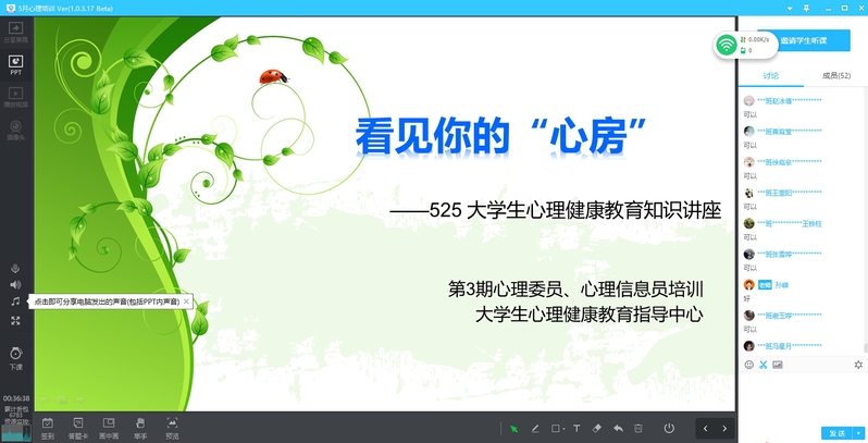 5月18日下午,智行书院第三期第3期心理委员、心理信息员心理知识培训如期开展。讲座通过腾讯课堂直播方式,由大学生心理健康中心申志敏老师主讲,智行书院全体辅导员以及73名心理委员全部参加了此次培训,培训结束后,辅导员给心理委员以及心理信息员进行培训分享,73名心理委员提交了培训心得。