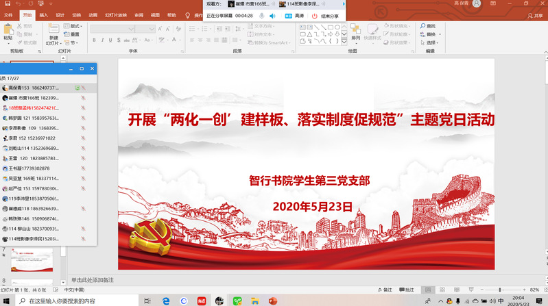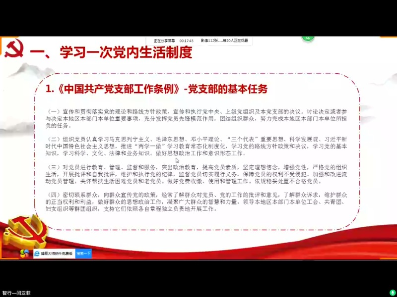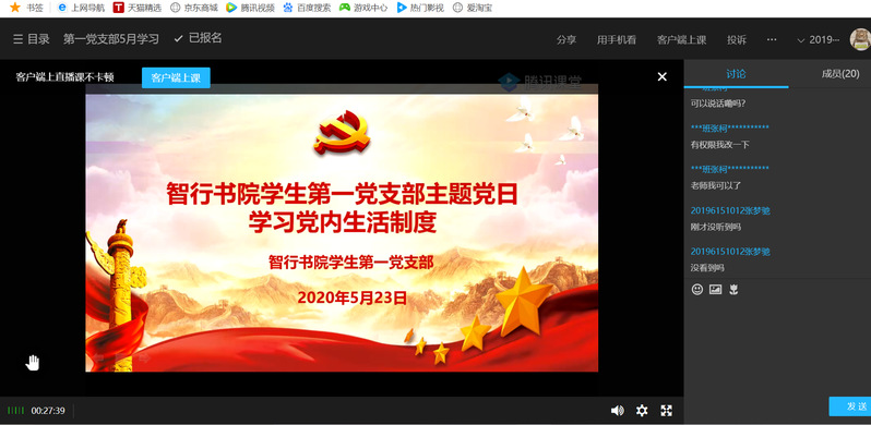 5月22日-24日,智行书院党总支各党支部以线上形式相继开展“‘两化一创’建样板、落实制度促规范”支部主题党日活动。活动分为五部分进行:学习一次党内生活制度、讲授一堂制度专题党课、缴纳一次党旗下的党费、提出一次合理化建议、开展一次党员志愿服务活动。