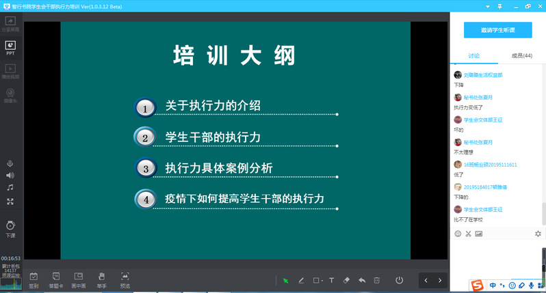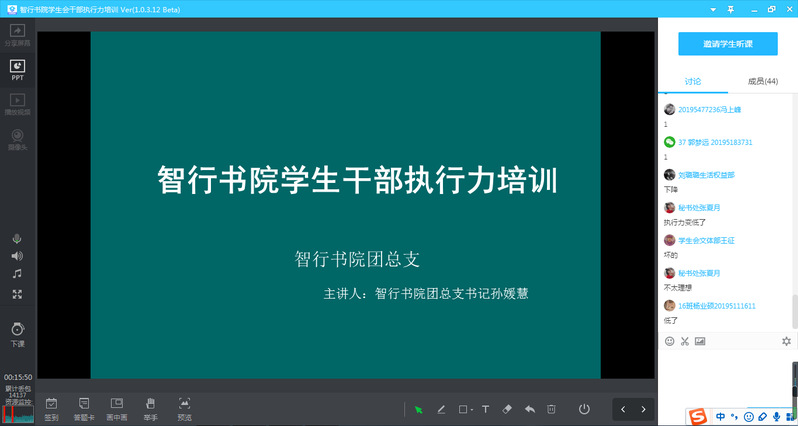 为提升书院学生干部在疫情防控期的综合能力,树立共建美好书院的远大理想。智行书院团总支于6月12下午1点以腾讯课堂的形式开展了“疫情下如何提高学生干部执行力”专题培训,本次培训由智行书院团总支书记孙媛慧主讲,书院全体学生干部参加。