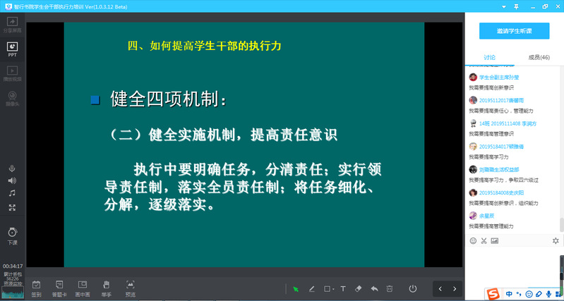 此次培训,孙老师围绕学生干部能力和素质的培养从“什么是执行力”、“学生干部的执行力”、“执行力具体案例分析”以及“疫情下如何提高学生干部的执行力”四个方面展开。孙老师详细讲解了“执行力”的定义,即处事应“快速行动,立即执行”,结合“学生干部的执行力”强调作为一名学生干部要有强烈的责任心和快速的行动力,紧接着从“执行力的具体案例分析”方面直观阐述,不论做任何事情,要思虑周全,顾全大局,力求达到“1+1>2”的效果。孙老师重点对“疫情下如何提高学生干部执行力”方面做出以下几点要求:第一,疫情下学生干部要对自身有更高要求,始终不忘初心,要以身作则,在学习与工作之间要学会规划时间,个人与集体之间要增强集体意识,最大化发挥个人价值;第二,要求学生干部提升决策能力,管理能力,组织能力,沟通能力,表达能力,创新能力。并分别从执行力的五大特点“高效性、责任心、创新性、纪律性、目的性”做出详细阐述;最后强调,特殊时期下的学生干部,更加要脚踏实地做好工作中的每一件小事,虚心听取他人的意见,怀揣感恩,争做新时代的优秀学生干部。