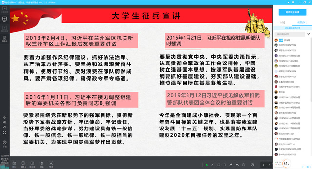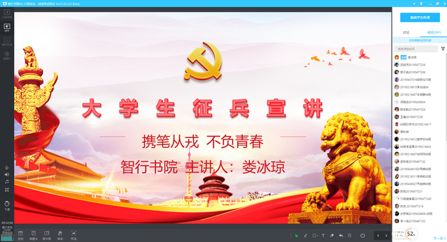 为促进国防现代化,推动军队科学发展,提高大学生全面素质的战略使命,提前做好征兵工作,把大批优秀青年送到部队,为新时期加强国防和军队建设奠定坚实基础。智行书院开展以“携笔从戎不负青春”为主题的征兵系列活动,此次活动智行书院全体辅导员通过线上直播宣讲的方式积极开展征兵入伍主题班会,智行书院全体学生参加。
