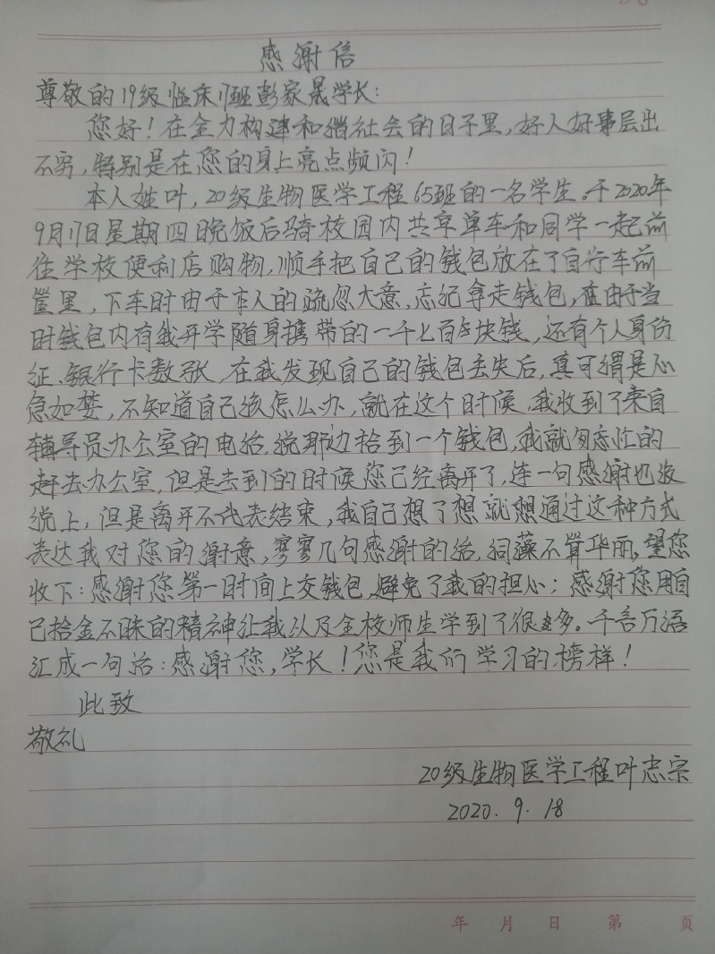 9月17日晚,叶志宗和同学一起骑共享单车前往校便利店购物,顺手把自己的钱包放在了车篮里,因为疏忽在停车时未记起拿走钱包,当时,钱包里有他开学携带的个人身份证、一千七百块现金及数张银行卡。钱包丢失后,叶志宗心急如焚。但就在不久后,他收到了来自辅导员老师的电话,让他前去认领,经确认后,叶志宗成功找回钱包,这时上交钱包的同学却已经离开。叶志宗通过问询,得知这位同学是智行书院2019级临床医学专业17班的彭家晟,为表达心中感激,他特地写了这封感谢信。叶志宗激动地说:“当我拿到自己钱包的一瞬间,真真被惊住了,不敢相信自己的眼睛,一股暖流从心中涌出来,我也要像学长一样,用善行影响更多的人!”