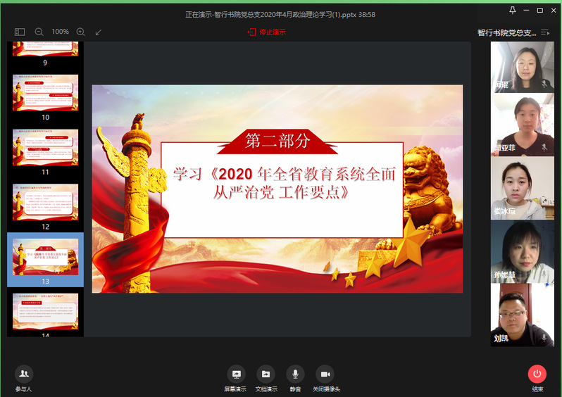 4月1日上午,智行书院党总支全体成员以线上会议形式开展四月份政治理论学习,由党总支书记刘凯带领同志们学习了习近平总书记在决战决胜脱贫攻坚座谈会上的讲话、以及《2020 年全省教育系统全面从严治党工作要点》。智行书院党总支全体党员同志参加。