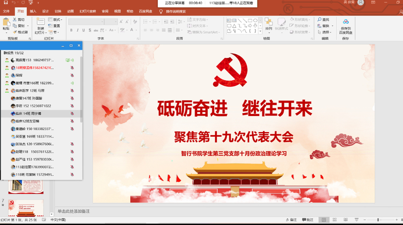 10月11日第三党支部通过网络会议的方式开展政治理论学习,第三党支部全体党员参加,会议由第三党支部李莹莹书记主持,本次政治理论学习围绕十九大重要内容展开。