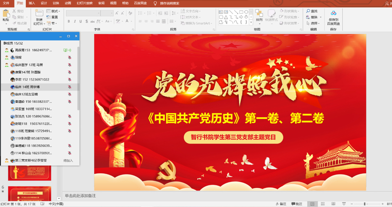 10月11日第三党支部通过网络会议的方式开展主题党日活动,第三党支部全体党员参加,会议由第三党支部李莹莹书记主持,本次主题党日活动围绕《论中国共产党历史》卷一和卷二展开。
