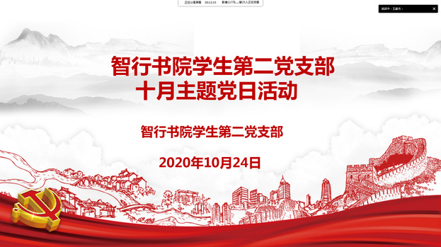 10月24日下午,智行书院学生第二党支部通过线上会议组织开展十月份主题党日活动。本次活动主题为《抗击新冠肺炎疫情的中国行动》白皮书,会议由党支部书记闫亚菲同志主持,支部全体党员参加。
