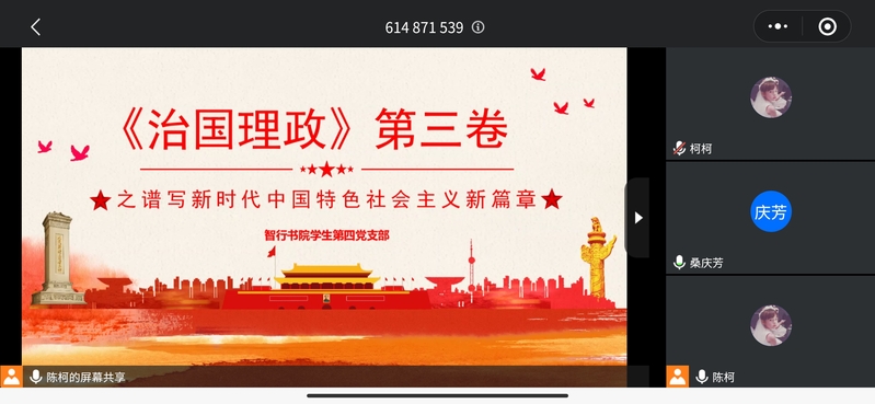 为认真落实我校关于《中央宣传部、中央组织部关于认真组织学习〈习近平谈治国理政〉第三卷的通知》要求,10月30日,智行书院学生第四党支部召开线上学习会,集中学习研讨《习近平谈治国理政》第三卷。会议由第四党支部书记陈柯同志主持,党支部全体党员参与。