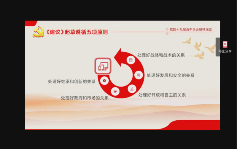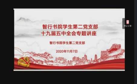 11月7日晚,智行书院学生第二党支部通过线上会议组织召开十九届五中全会专题讲座。会议由党支部书记闫亚菲主持,主要学习了十九届五中全会的有关内容和重要精神,支部全体党员参加了会议。