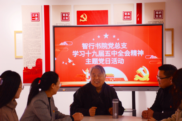 12月2日上午,智行书院党总支于新时代党员活动室召开“学习党的十九届五中全会精神”主题党日活动,省委宣讲团成员、中原经济发展研究院院长耿明斋教授受邀参加,并与师生代表进行座谈。