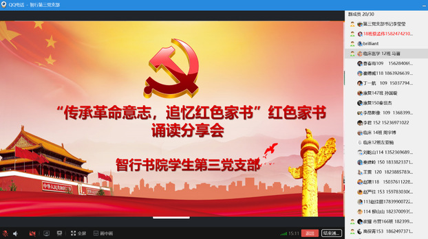 为弘扬民族优秀文化,感受共产党员和革命战士崇高的理想信念和坚强党性,传承中华文明,营造浓厚的读书学习氛围,智行书院党总支主办,学生第三党支部承办的“传承革命意志,追忆红色家书”红色家书朗读活动圆满落下帷幕。活动面向书院全体师生,共收到三十余份优秀诵读作品。