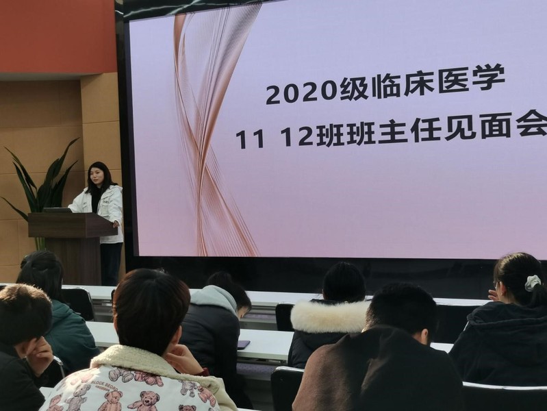 为贯彻落实党的教育方针,使学生思想政治教育与专业知识学习相辅相成,形成长期自主学习氛围,12月份,智行书院辅导员乔帆分别邀请基础医学院副院长苗莹莹,基础医学院老师袁欢欢、刘鹏飞,智能医学工程学院老师季超越,在四号楼组织并召开各班级“兼职班主任见面会”,2020级临床医学全体学生参加。