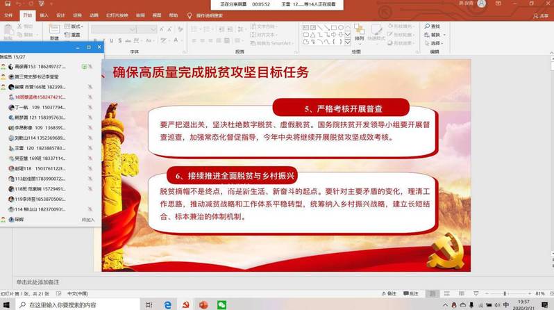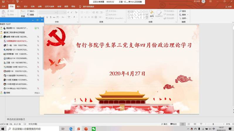 4月27日第三党支部通过网络电话的方式开展政治理论:“学习习近平总书记在决胜决战脱贫攻坚座谈会上的讲话精神”,第三党支部全体党员参加了此次会议,本次会议由第三党支部支部书记李莹莹同志主持召开。