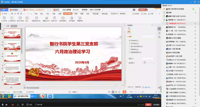6月25日智行书院学生第三党支部线上开展6月份“全面从严治党“政治理论学习,学习《党委(党组)落实全面从严治党主体责任规定》、《中共河南省委关于推进全面从严治党的若干意见》及《中共河南省委高校工作委员会关于推进高等学校全面从严治党向纵深发展的实施意见》第三党支部全体党员参加此次会议,会议由第三党支部李莹莹书记主持召开。
