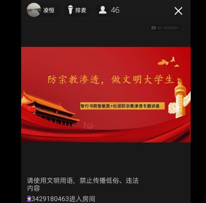 进一步普及和宣为传宗教反渗透的相关知识,树立学生科学、健康、积极的世界观与价值观,10月16日,智行书院智能医+社团开展“远离宗教、做文明大学生”防宗教渗透专题宣讲会,根据学校疫情防控工作要求,此次专题讲座采取线上会议开展,由社团指导老师李莹莹主讲。