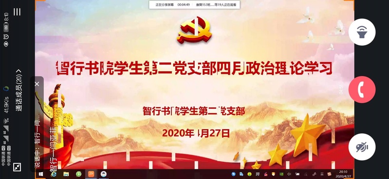 在决战脱贫攻坚关键时刻,为加强支部全体党员思想认识,贯彻落实党中央全面从严治党的要求,4月27日晚上,智行书院学生第二党支部于QQ视频召开四月份政治理论学习线上会议。本次线上会议由党支部书记闫亚菲主持,全体党员参加。