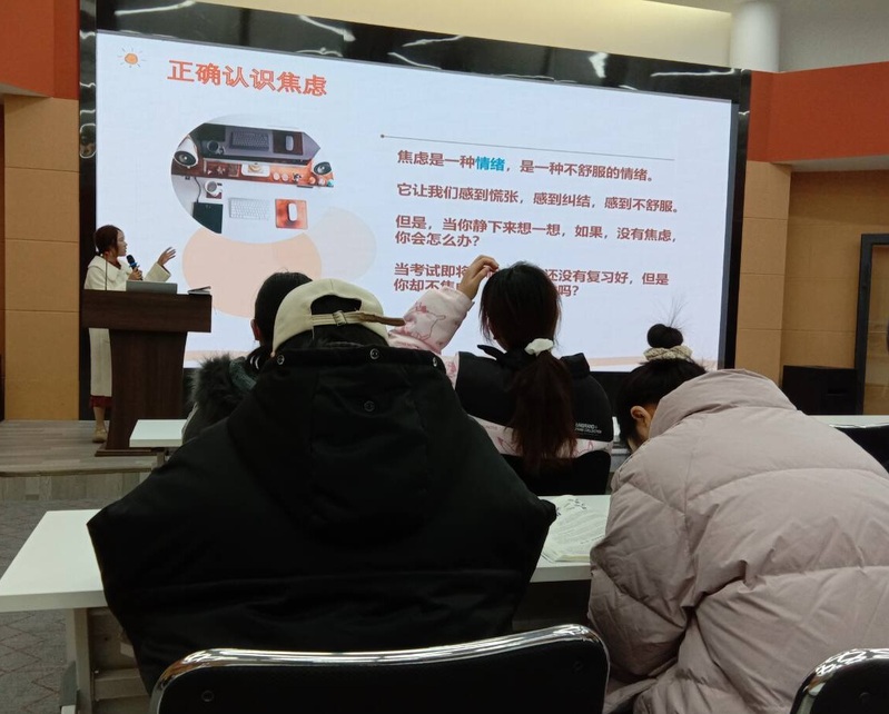 在短短的一个小时内,李莹莹老师通过聆听并分析同学们出现的一些考前焦虑行为,向大家阐述了考试焦虑会带来的各种负面影响,并用幽默诙谐的方式讲述了有关考试焦虑的四个方面:考试焦虑界定、考试焦虑表现、考试焦虑原因、如何调节考试焦虑。