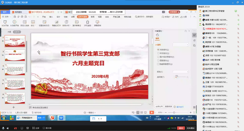 2020年6月23日智行书院学生第三党支部通过线上的方式开展了“学习民法典,争做普法人”主题党日活动。会议由第三党支部书记李莹莹同志主持,智行书院学生第三党支部全体党员同志参加了此次会议。