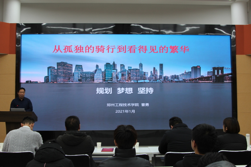 为进一步深化创新创业教育,推动创新创业教育与专业教育深度融合,打造优质创新创业导师团队,不断提高创新创业人才培养质量,1月7日下午,智行书院举办创新创业导师聘任仪式,聘任郑州工程技术学院创新创业学院曹勇老师为智行书院创新创业导师,并开展“从孤独的骑行到看得见的繁华”讲座。智行书院党总支书记刘凯、党总支副书记王莉、院务主任孙媛慧、通识教研室主任孙峰、辅导员娄冰琼、胡海洋等教师参加此次会议,聘任仪式由王莉主持。