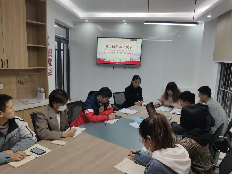 为深入学习贯彻总书记在全国脱贫攻坚总结表彰大会上的讲话精神,3月8日晚上,智行书院学生第一党支部在书院三号楼党支部工作站开展以“伟大脱贫攻坚精神”为主题的政治理论学习,全体党员参加。