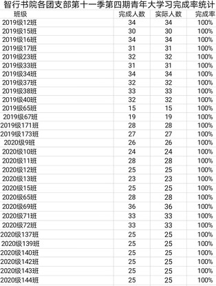 在这里,我们要对以下团支部提出表扬,各团支部应向他们看齐。同时,仍然有小部分团支部完成率不高,在这里就不在进行公示,希望这些团支部能及时自省,积极参与到每周的团课学习中。在新的一周里,希望大家能继续保持积极的学习 态度,坚持观看青年大学习,学习主题团课,也期待越来越多的团支部能够上榜,为其他团支部作出榜样。 下面对表现优异的团支部名单进行公示 :