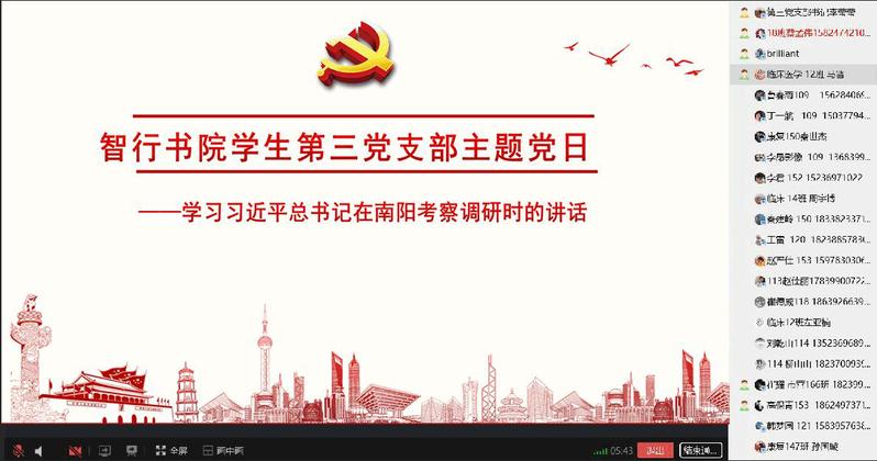 近日,习近平总书记到南阳考察调研,对南阳的南水北调渠首枢纽工程、南阳中医药产业、南阳月季产业、南阳夏粮生产情况等进行了实地考察和指导,并发表重要讲话,对进一步发展中医药作出重要指示。深入学习贯彻习近平总书记在南阳考察调研时的重要讲话和指示精神,意义重大。2021年5月26日智行书院学生第三党支部开展了“学习习近平总书记在南阳考察调研时的重要讲话”主题党日活动。