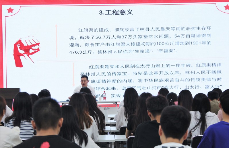 围绕《红旗渠精神》这一主题,王延生从“红旗渠简介”、“红旗渠故事”和“红旗渠精神的内涵”三个方面,用大量详实的数据、生动的历史图片和感人的榜样事例讲述了红旗渠的修建背景、修渠过程和红旗渠精神所蕴含的宝贵财富。他重点分享了青年凿通岩石隧洞的故事:300青年奋战17月凿通岩石隧洞;青年技术总监吴祖太、红旗渠总设计师杨贵等先进人物事迹。他用生动的故事和实例深入浅出地向师生阐述了“自力更生、艰苦奋斗、团结协作、无私奉献”的红旗渠精神的时代内涵。他激励大家要继承和弘扬红旗渠精神,要在红旗渠青年群像中认识时代担当,从红旗渠青年榜样身上汲取成长智慧。今天的青年们应该向红旗渠上的青年们致敬,向敢担当、有作为、创奇迹的他们学习,进而自觉地承担起新时代的时代责任。只有这样,才能处理好个人与时代的关系,才能借助于时代的舞台,在担当中历练,在尽责中成长,成为驱动中华民族加速迈向伟大复兴的磅礴力量。
