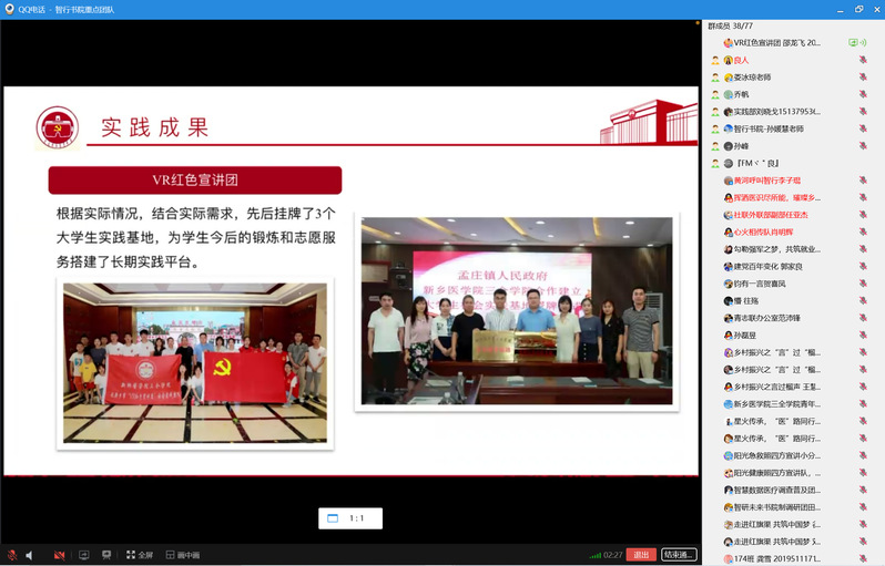 为落实智行书院暑期社会实践团队成果,智行书院团总支于9月22日-24日中午12点-14点利用QQ线上平台举行了2021年暑期社会实践团队答辩评审会。本次评审会由校团委史良老师、智行书院团总支书记孙媛慧老师、通识教研室主任孙峰老师及全体辅导员老师担任评委,青年志愿者联合会成员李涛主持,203支来自书院的团队积极参与其中,展示各自的风采。