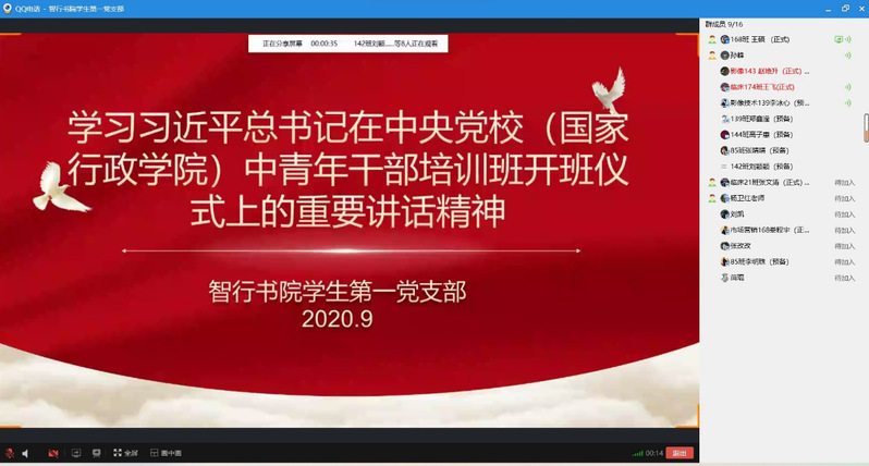 9月10日,智行书院学生第一党支部在腾讯课堂开展以“学习习近平总书记在中央党校(国家行政学院)中青年干部培训班开班仪式上的重要讲话精神”为主题的政治理论学习活动,由党支部书记孙峰主持,第一党支部全体党员参加。