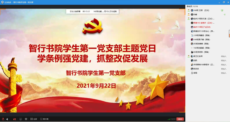 2021年9月22日,智行书院学生第一党支部在腾讯课堂开展“学条例强党建,抓整改促发展”主题党日活动。第一党支部全体党员参加会议,由第一党支部书记孙峰主持召开。