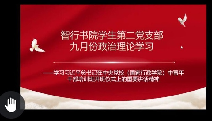 为深入习近平总书记在中央党校(国家行政学院)中青年干部培训班开班式上的重要讲话,响应习近平总书记对全国广中青年干部提出的着力提升政治敏锐性和政治鉴别力的要求,智行书院学生第二党支部于9月22日于线上展开九月份月份政治理论学习,支部全体22名党员参加。
