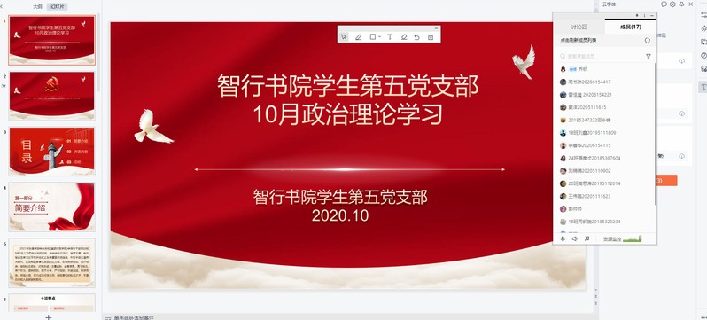 为进一步学习关于党委下发的十一项理论学习内容,坚定理想信念对党忠诚,10月22日,智行书院学生第五党支部在腾讯课堂线上会议开展十月份政治理论学习活动,会议由智行书学生第五党支部书记乔帆组织并主持,学生第五党支部全体党员参加。