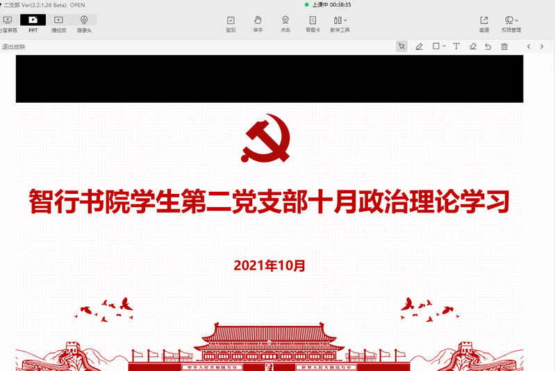 为深刻领会学习习近平总书记重要讲话精神,秉承先驱遗志,砥砺奋进,凝心聚力向着第二个百年奋斗目标昂首进军,展现新青年风采风貌。10月25日,智行书院学生第二党支部利用线上直播平台的方式,集中学习了“习近平总书记在纪念辛亥革命110周年大会上的重要讲话”、“习近平总书记回信勉励全国高校黄大年式教师团队代表”、“习近平总书记在中央人才工作会议上强调深入实施新时代人才强国战略加快建设世界重要人才中心和创新高地”等内容,并以此为主题开展学习了十月份政治理论学习集体会议。