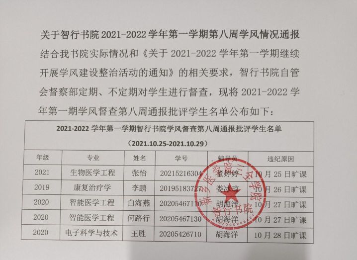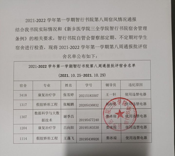 依据《新乡医学院三全学院智行书院宿舍管理条例》的相关要求,智行书院自管会定期对学生宿舍卫生检查,现将2021—2022学年第一学期第九周卫生检查情况进行公示: