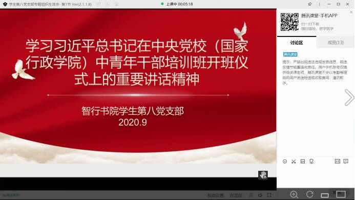 9月14日下午,智行书院学生第八党支部开展“学习习近平总书记在中央党校中青年干部培训班开班仪式上的重要讲话精神”政治理论学习。本次会议在腾讯课堂进行,由支部书记娄冰琼主持,学生第八党支部全体参加。