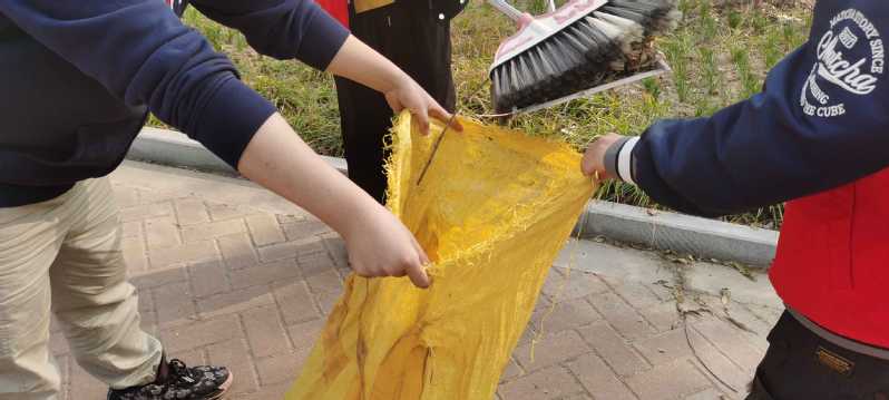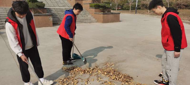 伊始,志愿者们按时集合进行分组,在领到劳动工具后,各个小队前往各自的劳动区域进行落叶清扫。随后,同学们手持扫把等卫生清扫工具,挽起袖子齐动手,清扫校园路面上的落叶和垃圾,重点对下水道边沿、井盖周围的落叶进行集中清扫,避免出现树叶阻塞下水道的安全隐患。在清扫过程中,志愿者们小组分工,团结合作,清扫和倾倒落叶同时进行,大大提高了工作效率。