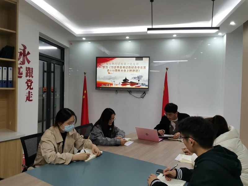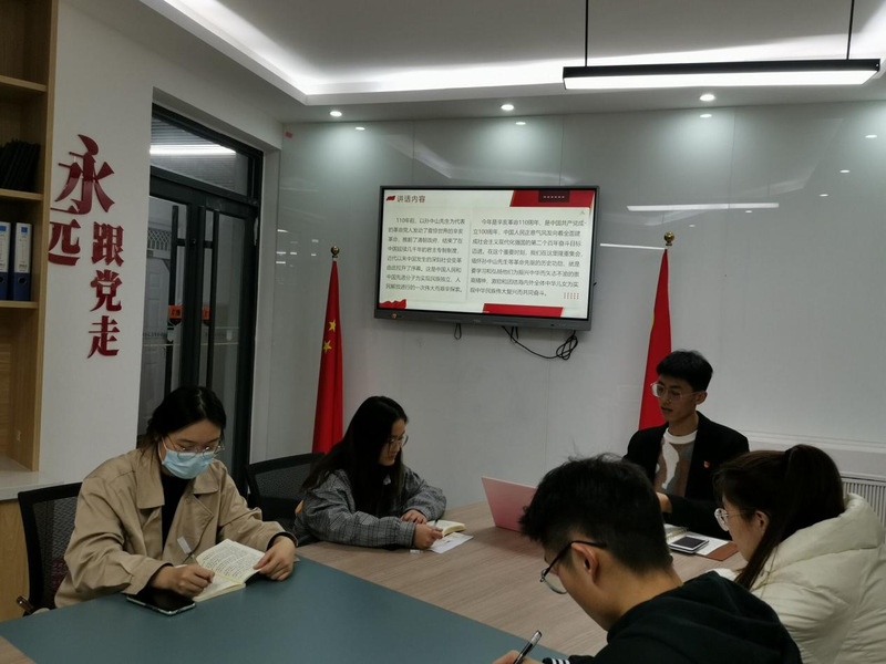 会议开始,孙峰先带领我们学习了关于《习近平总书记在纪念辛亥革命110周年大会上的讲话》内容。会上,孙峰讲到今年是辛亥革命110周年,是中国共产党成立100周年,中国人民正意气风发向着全面建成社会主义现代化强国的第二个百年奋斗目标迈进。在这个重要时刻,我们在这里隆重集会,缅怀孙中山先生等革命先驱的历史功勋,就是要学习和弘扬他们为振兴中华而矢志不渝的崇高精神,激励和团结海内外全体中华儿女为实现中华民族伟大复兴的中国梦而共同奋斗,并以PPT的形式对重要讲话的内容进行详细的讲授。